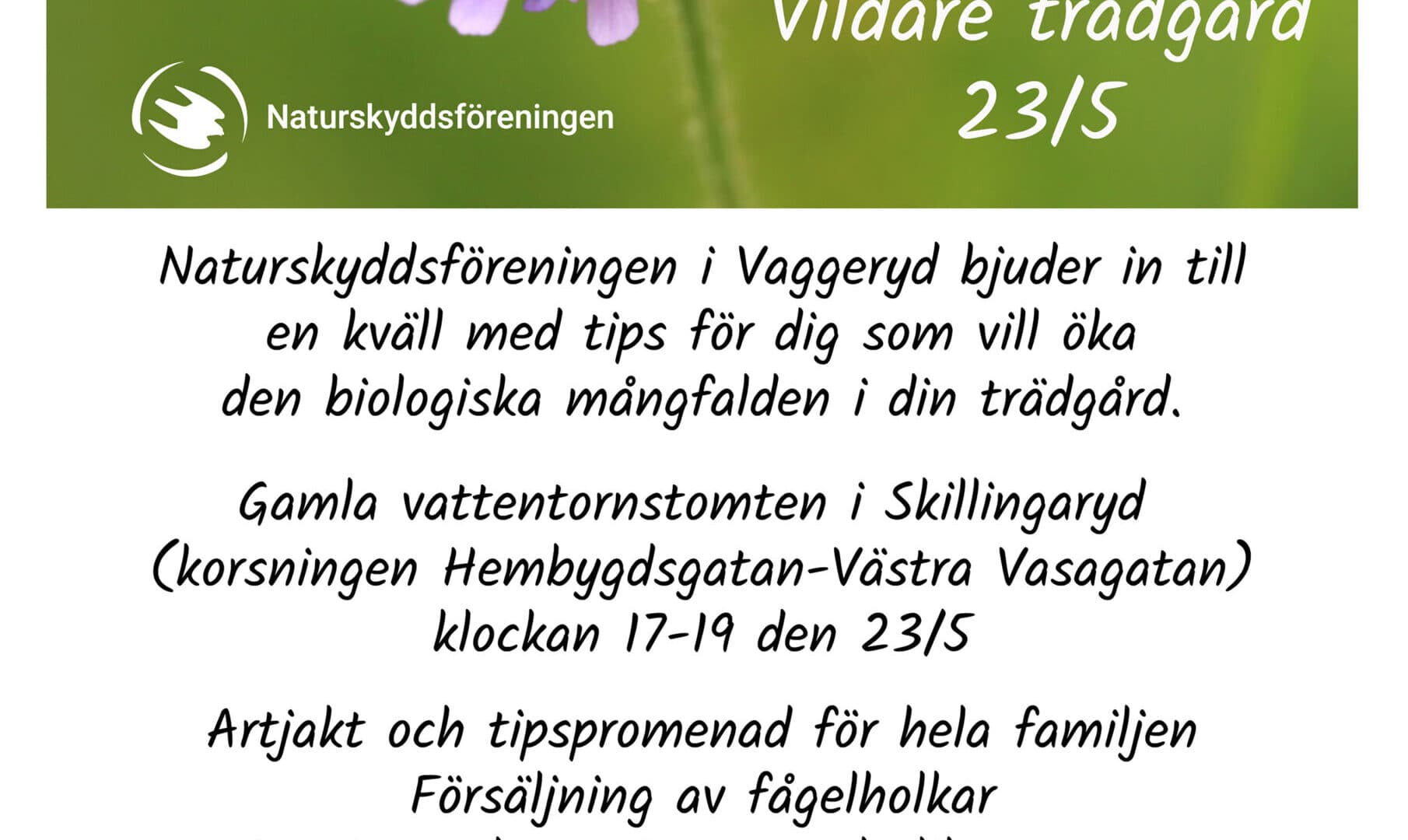 I Vaggeryds kommun arrangeras årligen en dag som kallas Vaggerydssurret där kommunen tillsammans med Remida, ett kreativt återanvändingscenter som jobbar med pedagoger och barn, skapar ett event om biologisk mångfald på torget i någon av kommunens orter. Vi deltog med information om Naturskyddsföreningen på Vaggerydssurret och Remida deltog med en aktivitet riktad mot barn på vildare trädgårdskvällen. Vaggerydssurret ägde rum några dagar innan Vildare trädgårdskvällen och de båda arrangemangen gav draghjälp åt varandra. Förutom de olika stationerna hade vi en artjakt, tipspromenad, holkförsäljning och växtförsäljning. Det blev en väldigt trevlig kväll med ca 60 besökare.