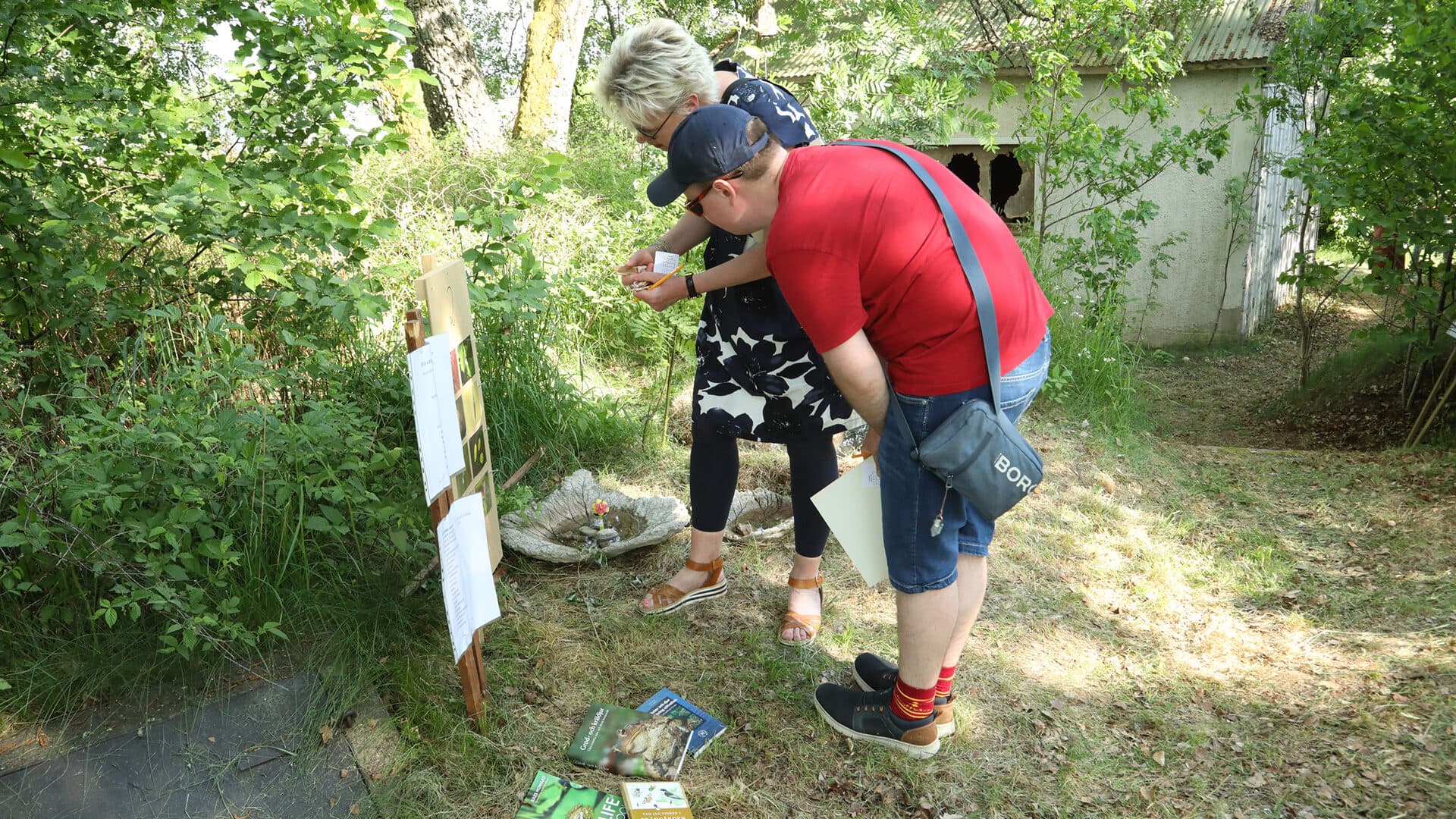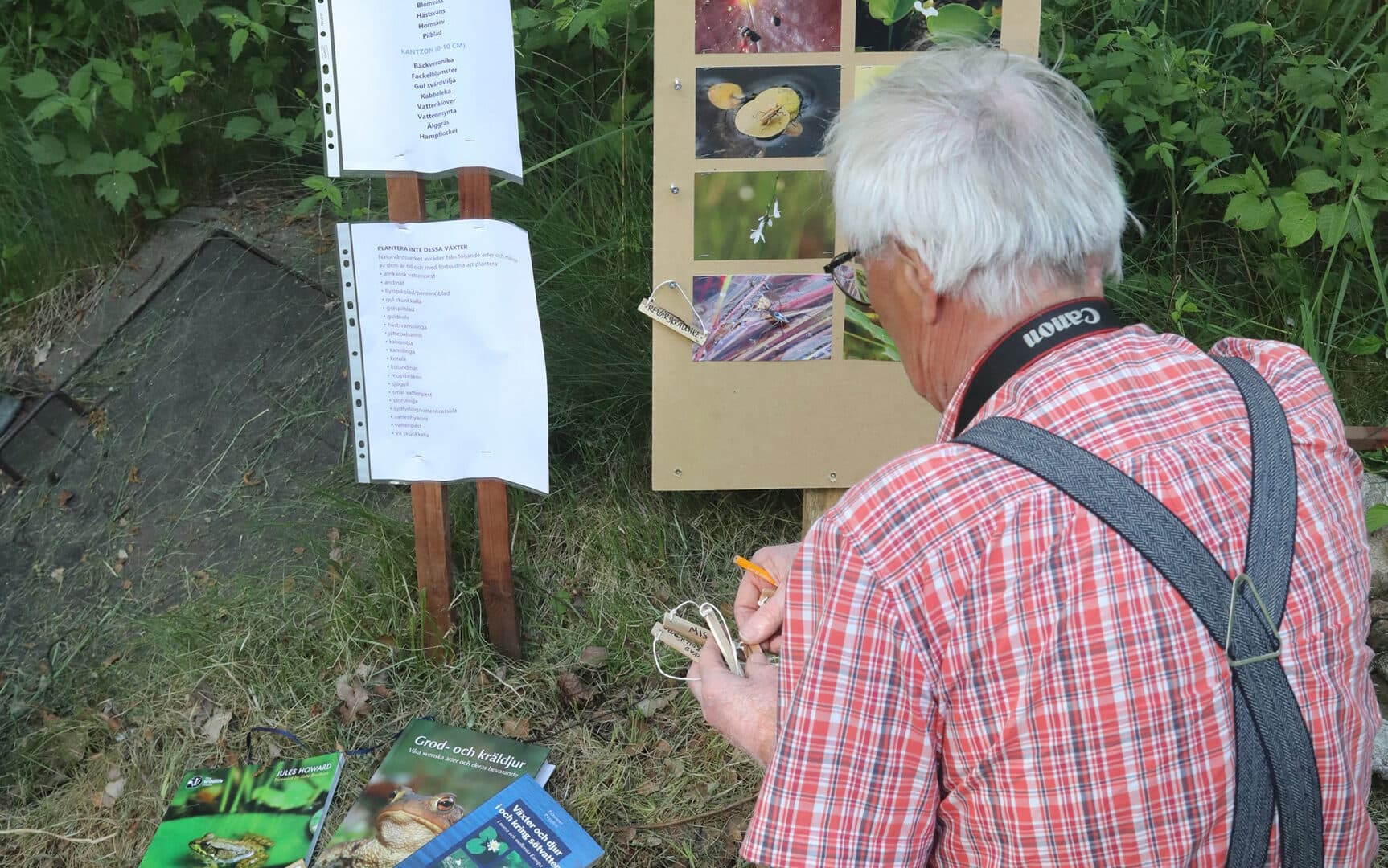 En härlig försommarkväll i maj månad bjöd naturskyddsföreningen i Vaggeryd in till en inspirationskväll med temat vildare trädgård. Vi hade lånat en ödetomt i Skillingaryd som låg granne med hembygdsgården, som även hade sina utställningar öppet under kvällen. Den vildvuxna tomten i kvarteret sälgen var perfekt för ändamålet och det enda vi behövde göra var att klippa små gångar som besökarna kunde vandra på. Målsättningen med kvällen var att inspirera och visa på små enkla åtgärder som alla kan göra i sin trädgård för att öka den biologiska mångfalden. Vi gjorde detta genom att skapa ett antal stationer med olika teman längs med slingan på ödetomten. Den första stationen handlade om sand och stenpartier och en mindre sandblotta hade skapats. Till detta hade vi informationskyltar och böcker som handlade om sandgynnade arter. Övriga stationer handlade om slåtteräng, fjärilar, vatten, ostädade områden, träd och buskar. Hasselmusholk, fladdermusholk, igelkottshus och olika bihotell hade placerats ut och det fanns litteratur som besökarna kunde kika i. Tack vare att Hembygdsföreningen skapat en slåtteräng i hembygdsparken så kunde vi lägga den stationen där. Vi utförde även en inventering av slåtterängens växter åt hembygdsföreningen som vi ska följa upp kommande år.